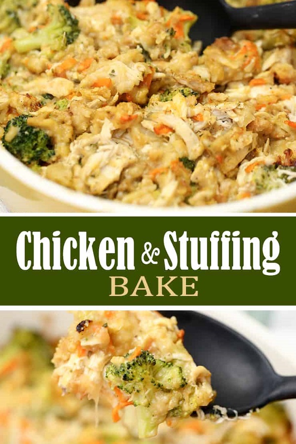 - In a bowl, mix together the stuffing mix, shredded cooked chicken, diced onion, shredded carrot and steamed broccoli. Place combined into a greased baking dish.